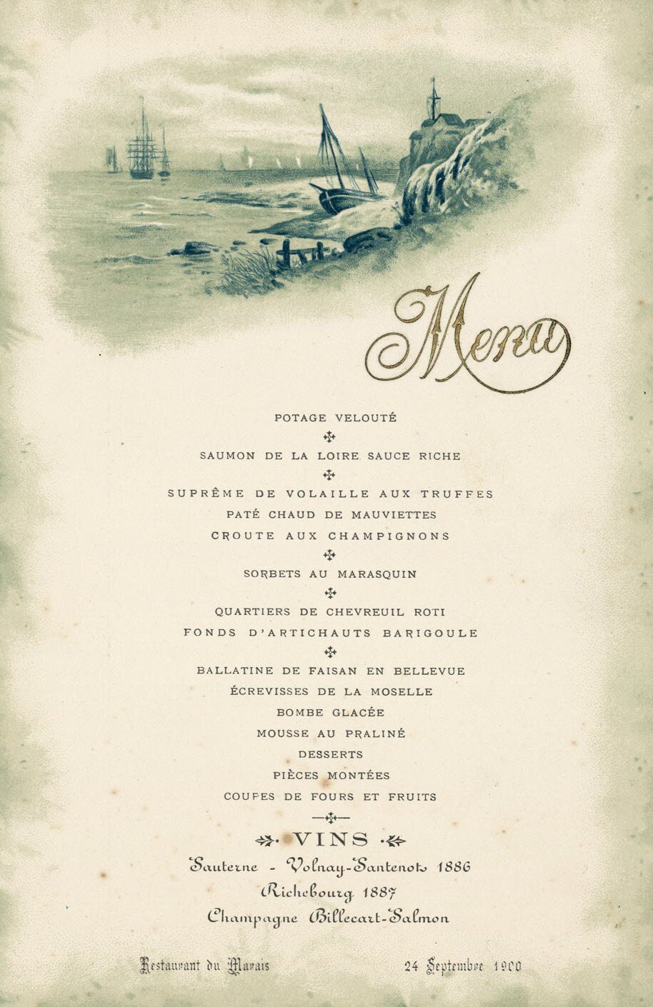 On y retrouve des menus de repas officiels (banquets politiques, dîners diplomatiques…), des menus de restaurants et de palaces divers et variés, des menus de compagnies de transports (trains, paquebots, compagnies aériennes…), ou encore des menus privés, issus de réceptions de notables et de particuliers.
